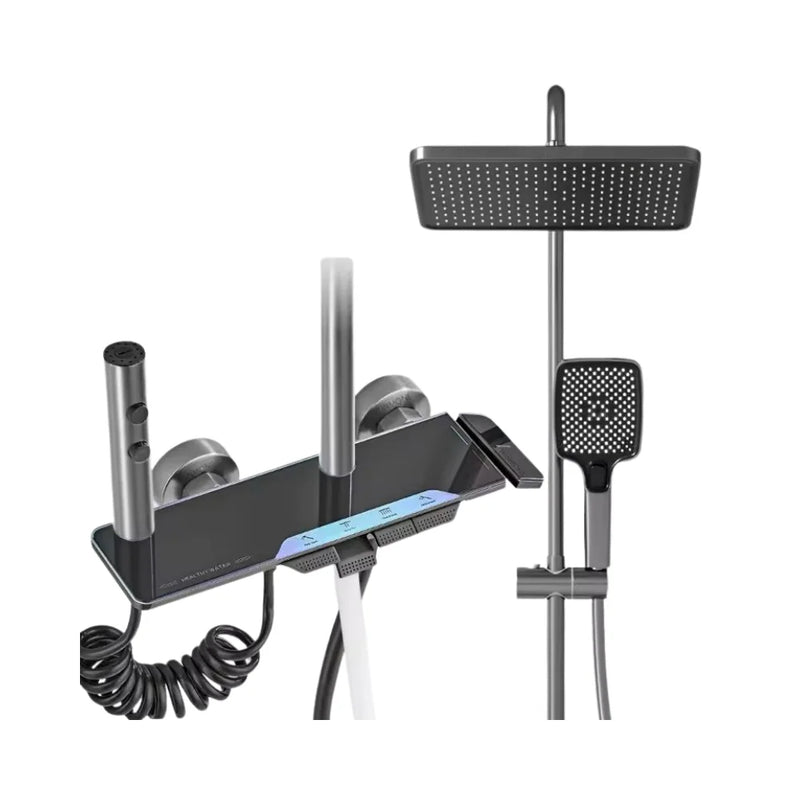 خلاط دش حمام ذكي بتصميم عصري ولون أسود رمادي أنيق، مناسب للحمامات الحديثة والتشطيبات المودرن.النظام 4×1 يوفّر لك تجربة استحمام متكاملة من خلال التحكم في أكثر من مخرج مياه بسهولة وسلاسة.