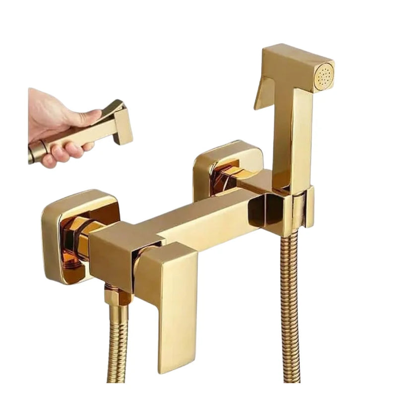 خلاط الشطاف الذهبي سكوير بتصميم هندسي عصري يناسب الحمامات الحديثة والفاخرة.يوفر تحكمًا عمليًا في المياه الساخنة والباردة، مع جسم نحاس قوي وتشطيب ذهبي أنيق يضيف لمسة ديكور مميزة.