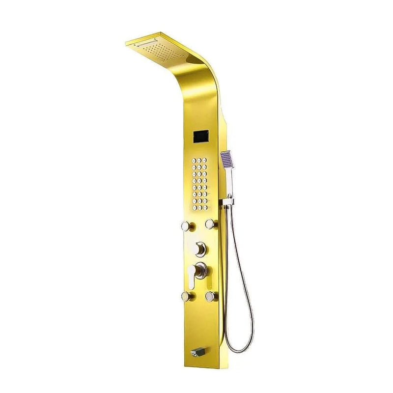 ( طلب مسبق ) شاور بانل 339 بشاشة ديجيتال إرتفاع 150 سم بعدد 4 جيت خلفى متحرك و دش علوى و مخرج سفلى والمحول وسماعة دش جانبية بالخرطوم اللون ذهبى لامع من كيان - كيان - للأدوات الصحية والديكورات الحديثة